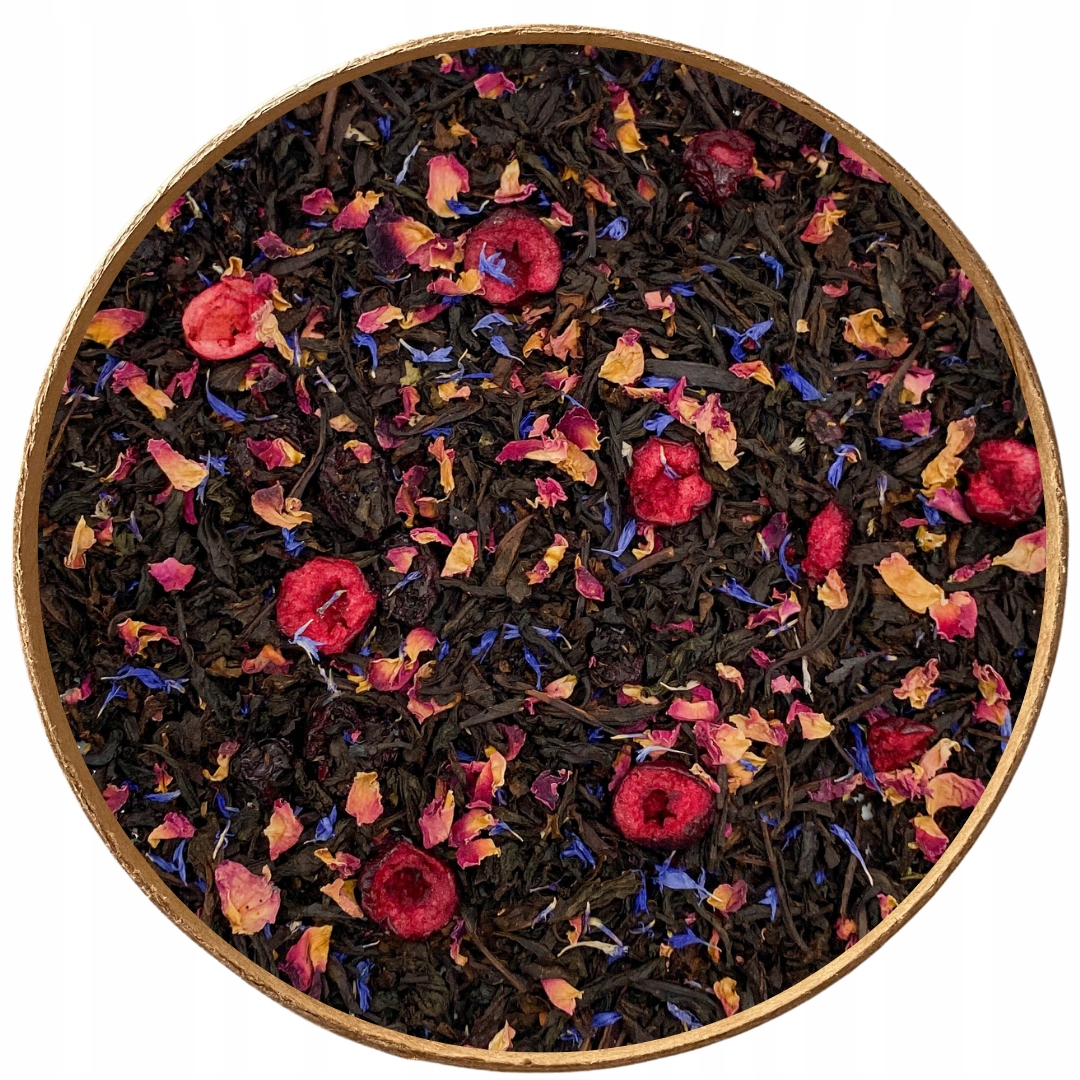 Składniki: herbata czarna Ceylon, wiśnia liofilizowana, płatek róży, bławatek niebieski, aromat.